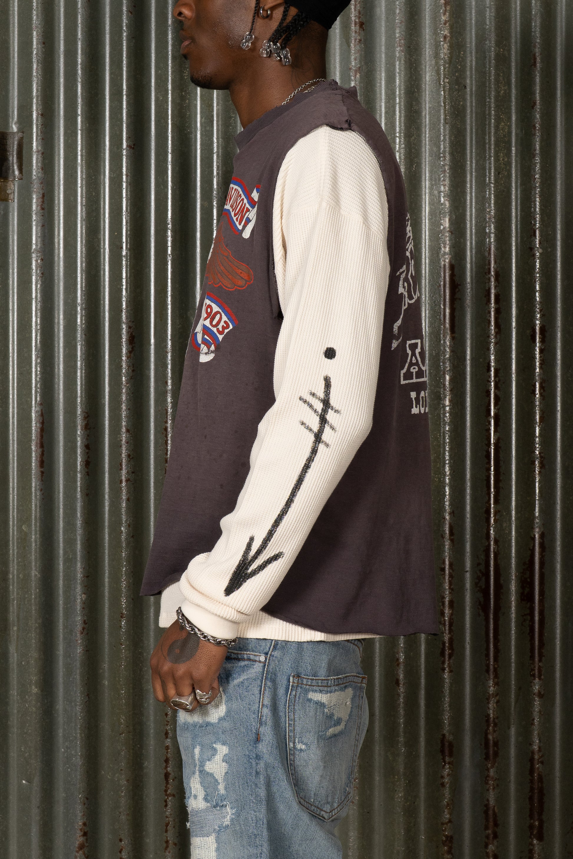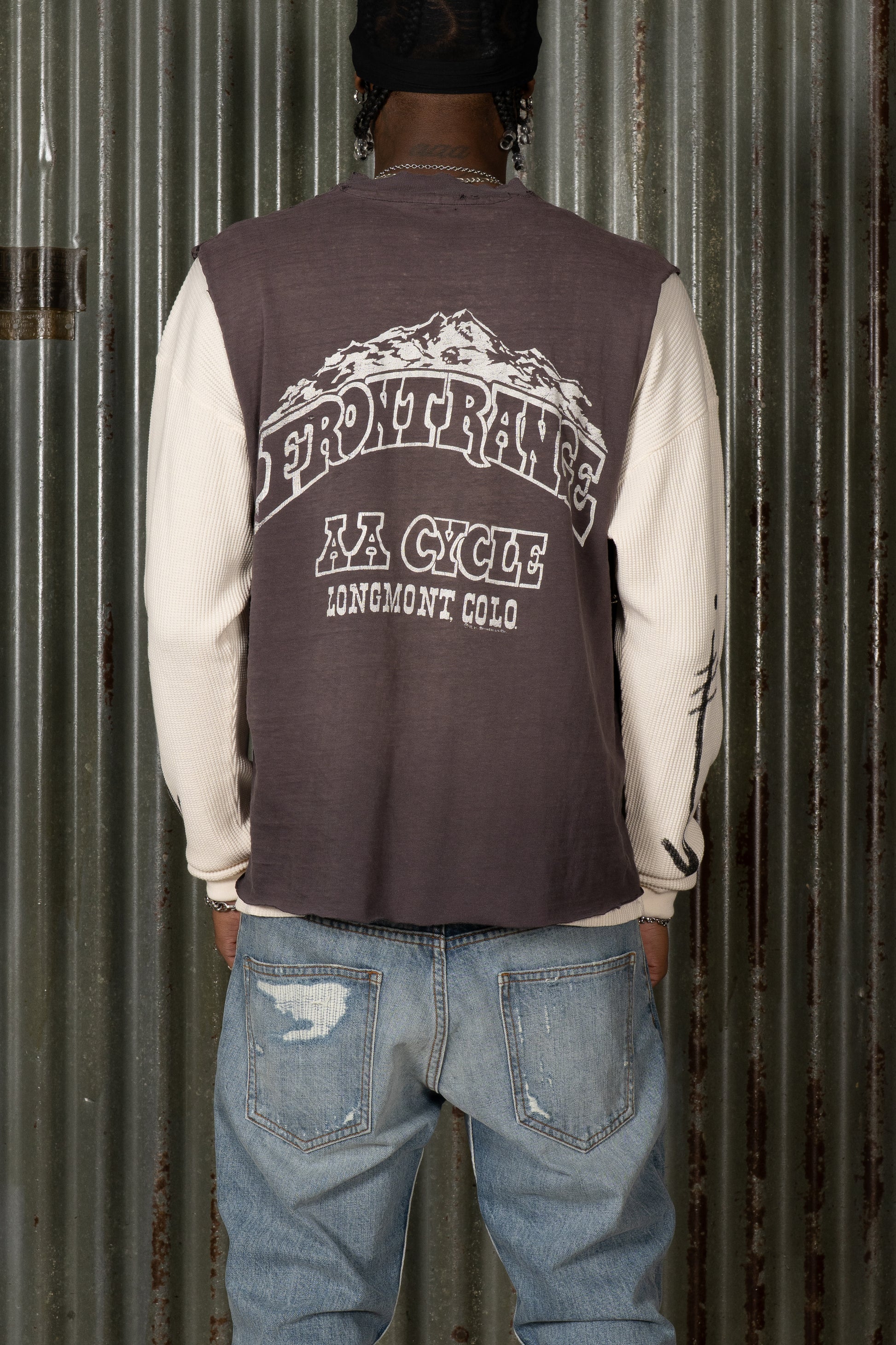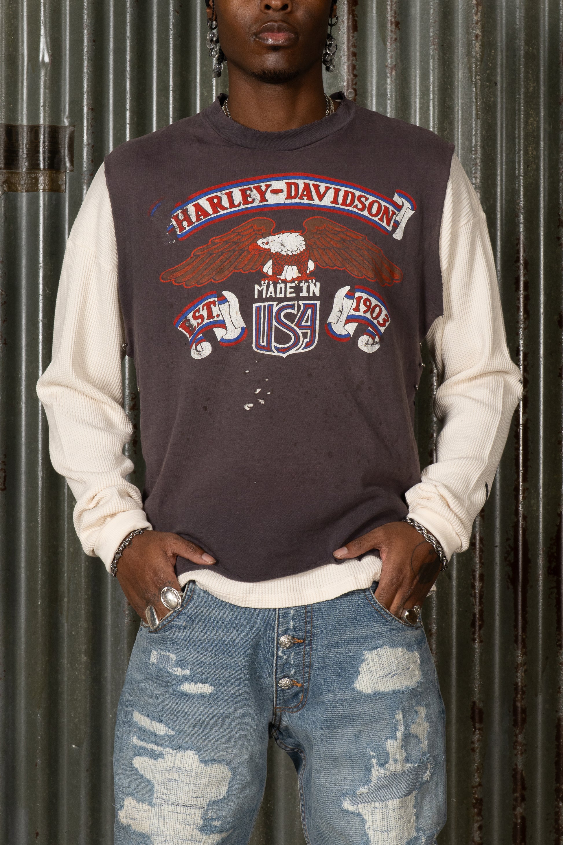 Introducing The Rider Rework. Crafted from 100% cotton, this piece features a layered construction combining a printed front graphic panel with long sleeve underlayer detailing. The reworked composition and vintage-inspired surface give it a broken-in, lived-in finish. Completed as part of the BORN II LIVE Collection.
