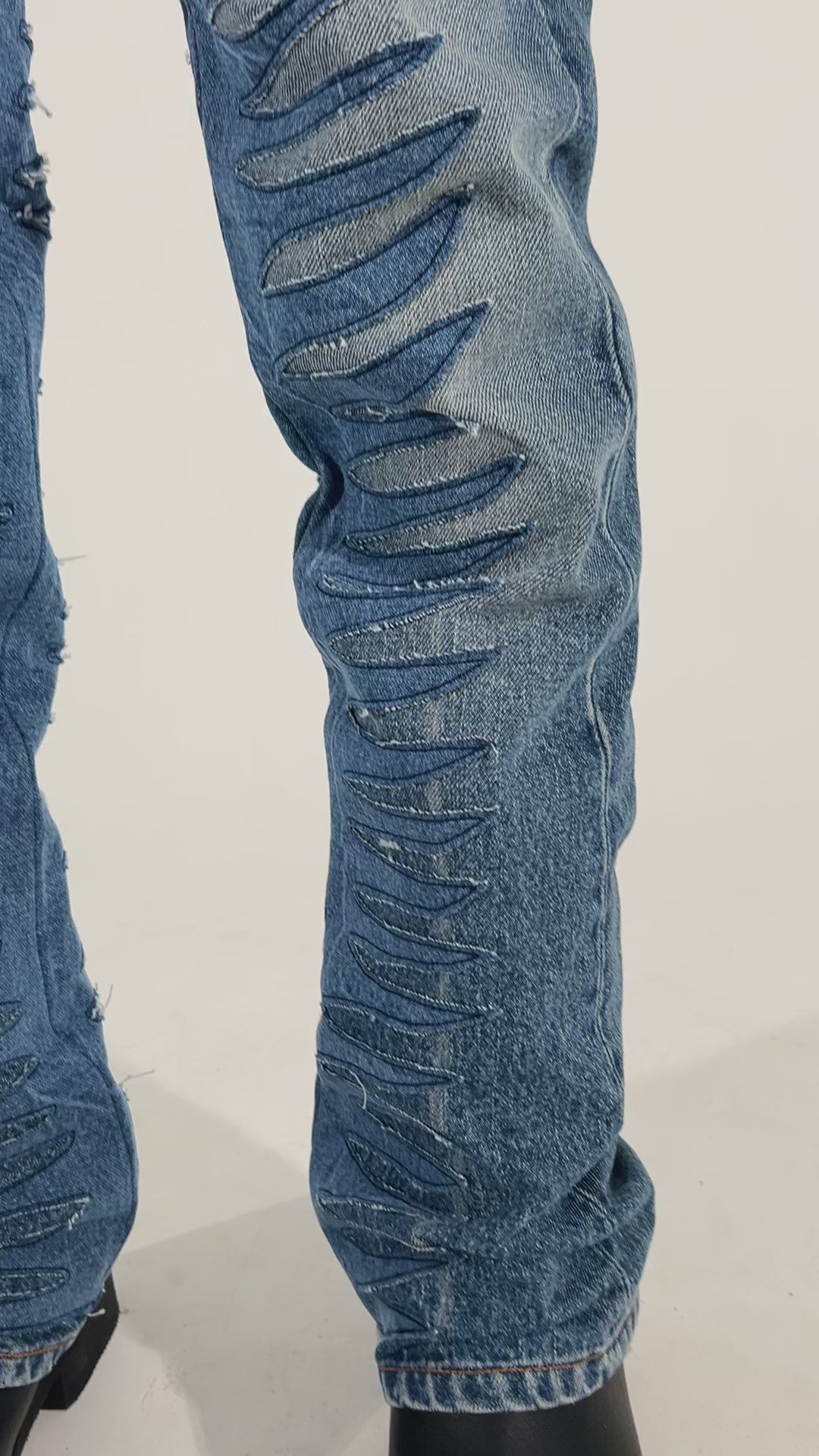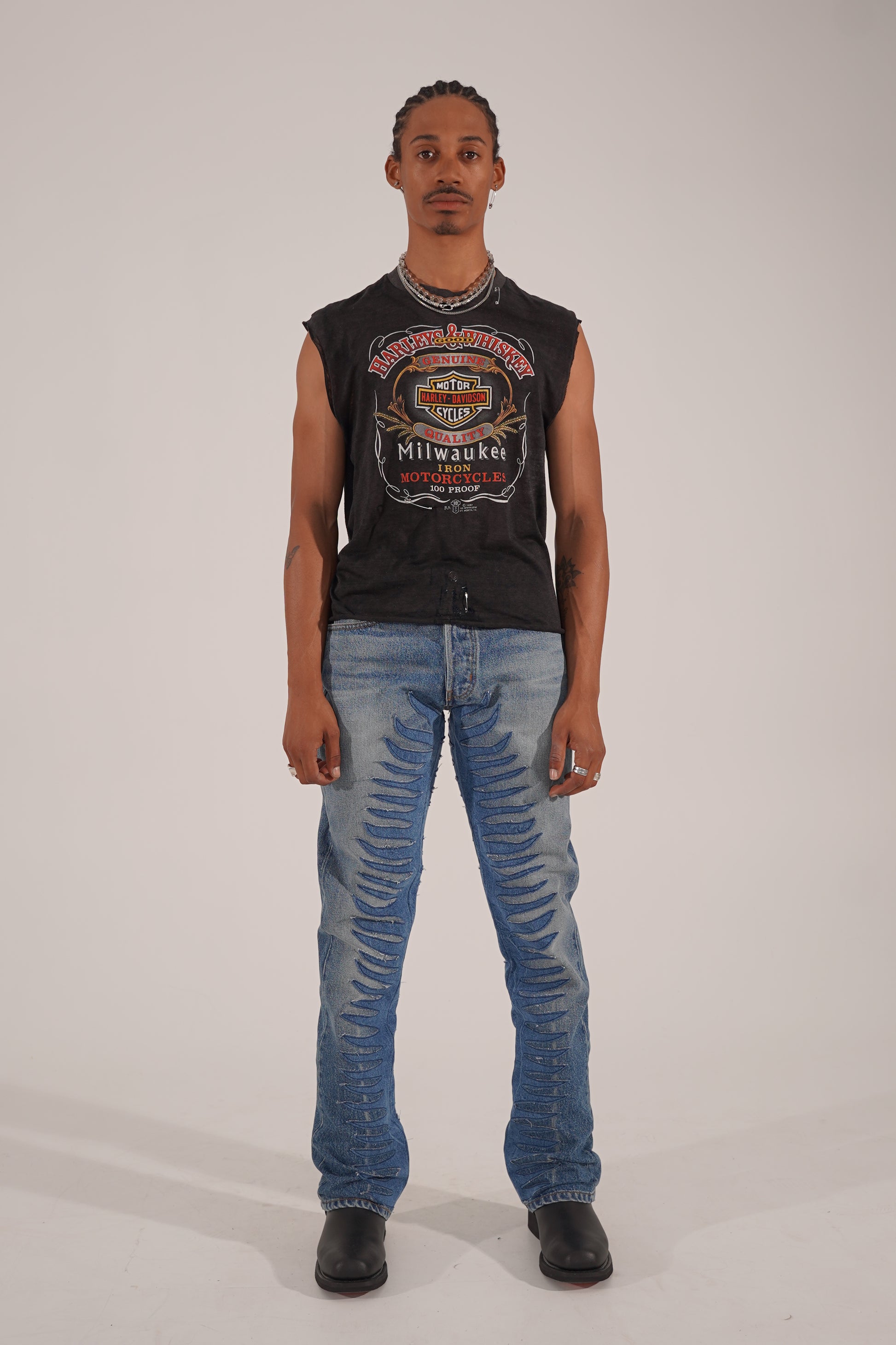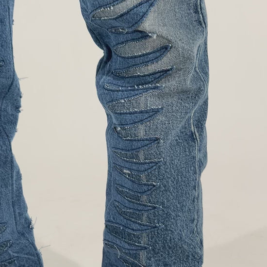 Wir stellen die Sun Ray Denim Pant vor. Sie ist aus hochwertigem Denim gefertigt und verfügt über kontrastierende Denim-Applikationen, die von der Rock-Ära inspiriert sind.