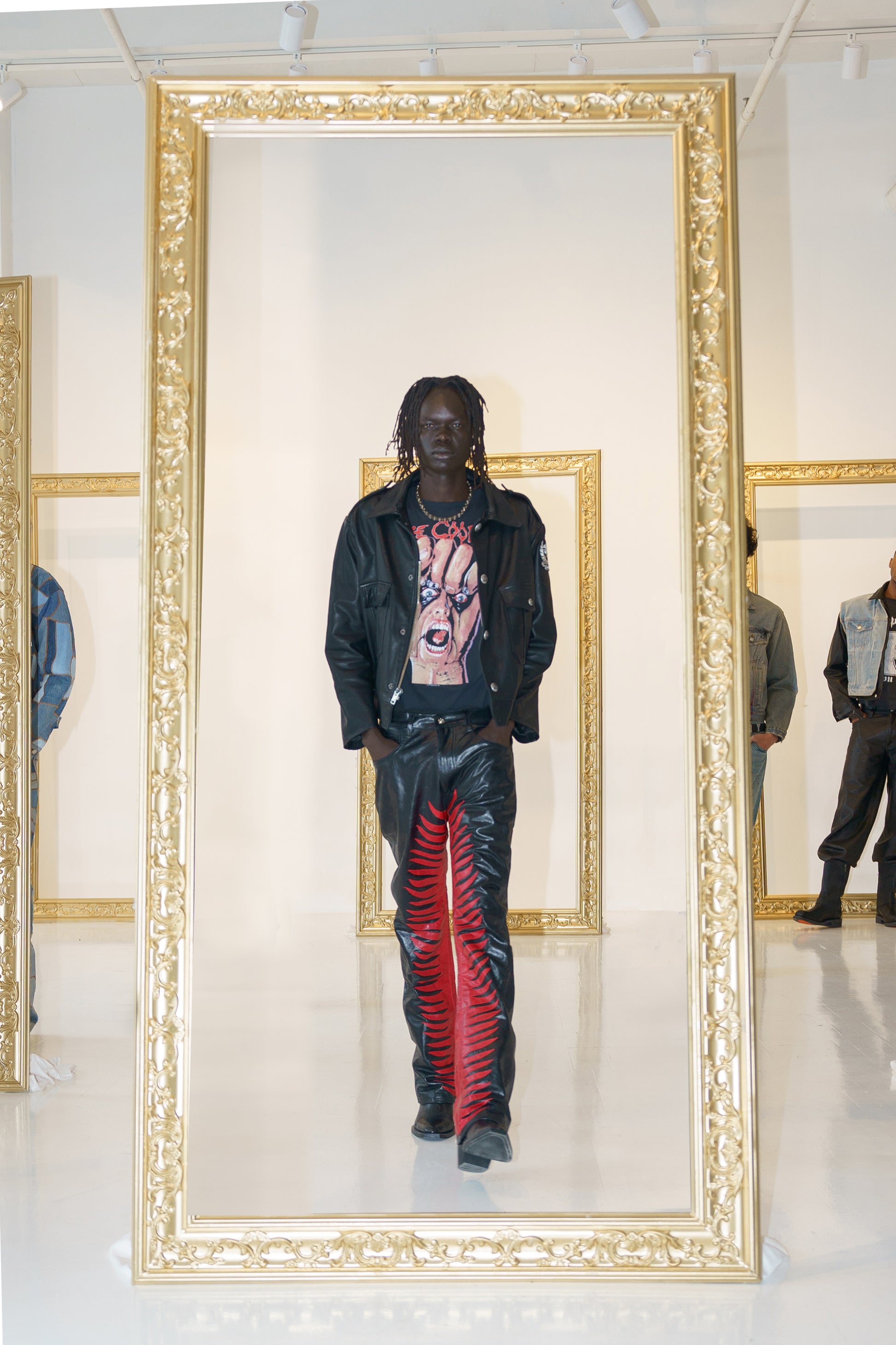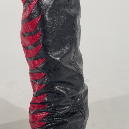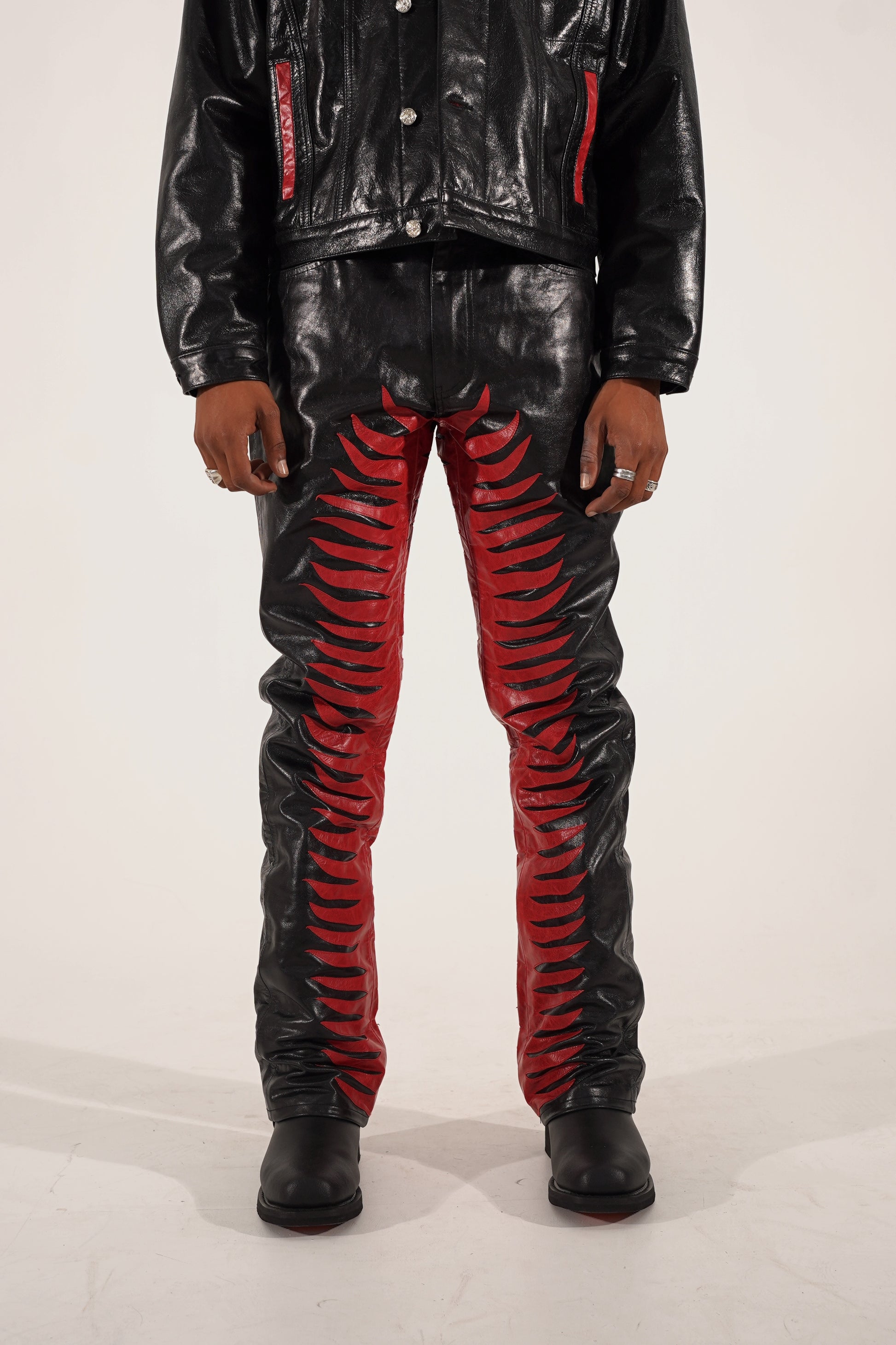 Wir stellen vor: Die Sun Ray Lederhose. Die aus hochwertigem Rindsleder gefertigte Hose ist mit Lederapplikationen versehen, die von der Rock-Ära inspiriert sind. Sie ist mit weichem Satin gefüttert und bietet Stil und Komfort in einem eleganten Design.