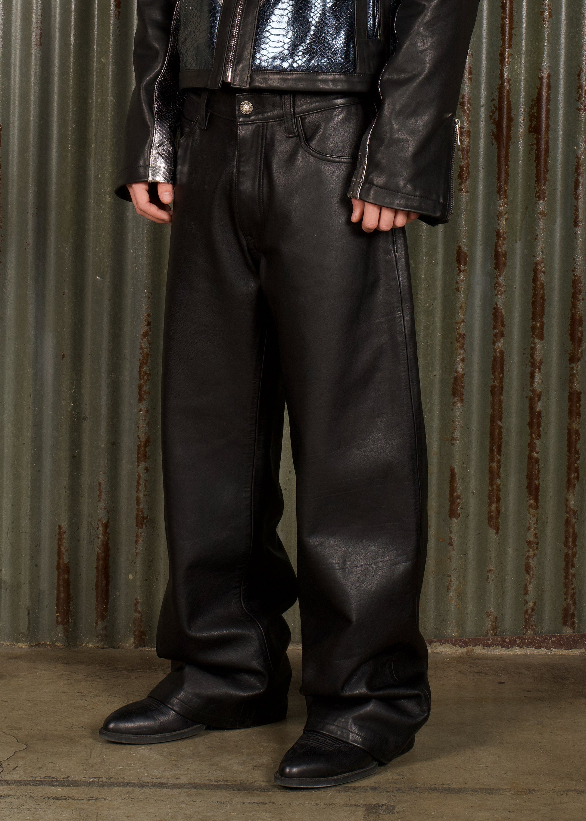 Presentamos el pantalón de cuero Inner Tuber. Fabricado con cuero vacuno de primera calidad, este pantalón presenta una silueta ancha para una apariencia relajada pero refinada. Terminado con nuestra clásica etiqueta de metal/cuero en la parte posterior.