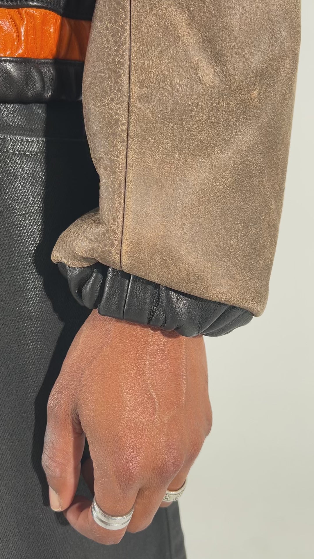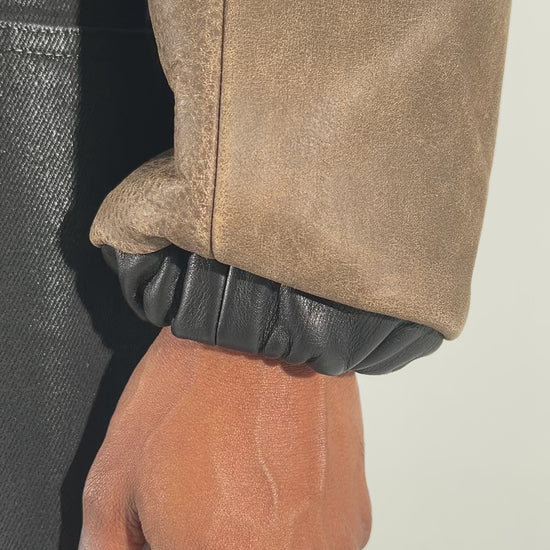 A staple of our collection, this jacket is fully constructed from premium cowhide leather. It features leather appliqué letters enhanced with intricate embroidery, while the doves on the back are rendered in detailed chain stitch embroidery. A timeless piece that combines classic craftsmanship with distinctive design.