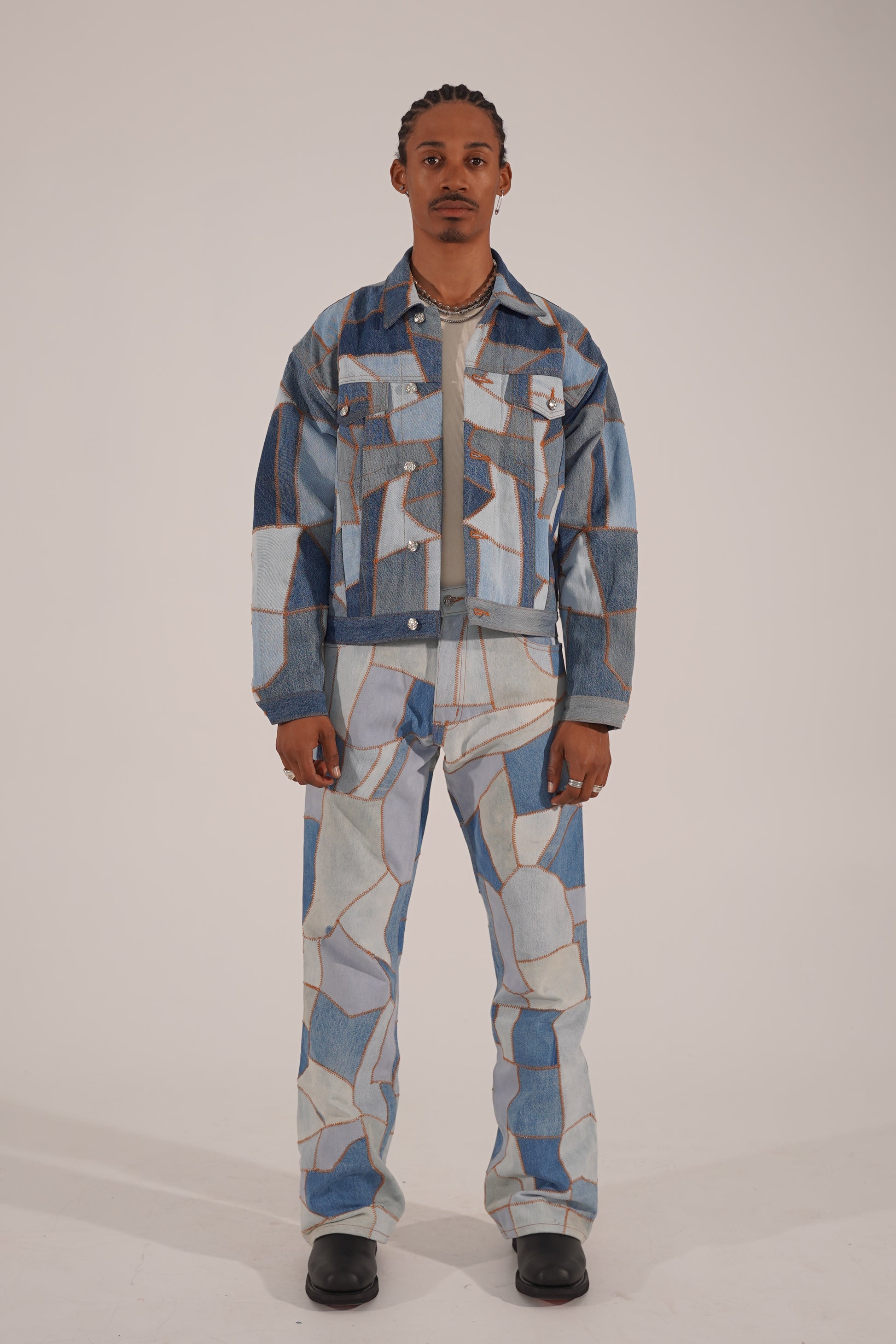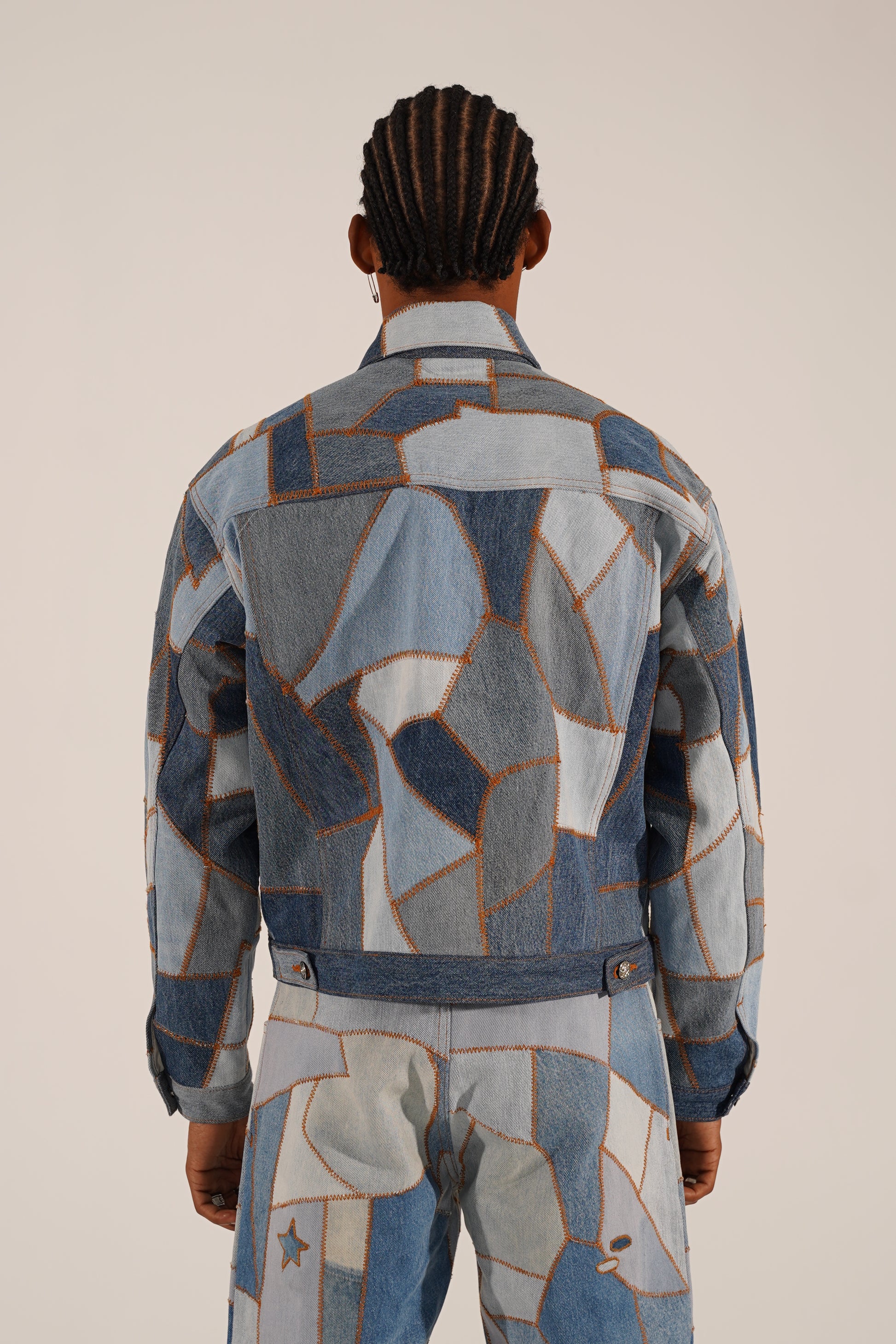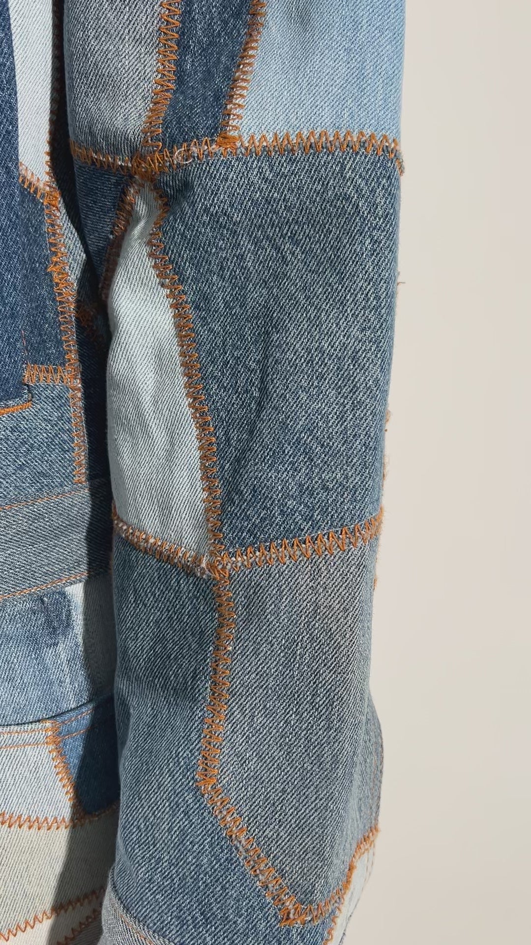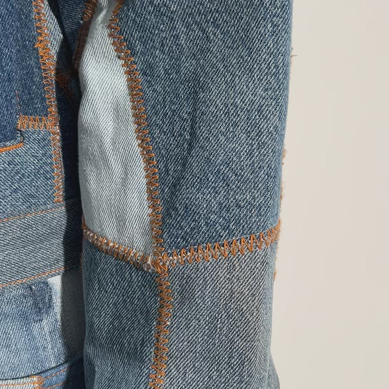 介绍 美体小铺牛仔夹克.这款夹克采用回收的牛仔布制成,面料从解构的复古牛仔裤上裁剪下来,确保每块面料都是独一无二的。每件单品都将可持续发展与个性完美融合。