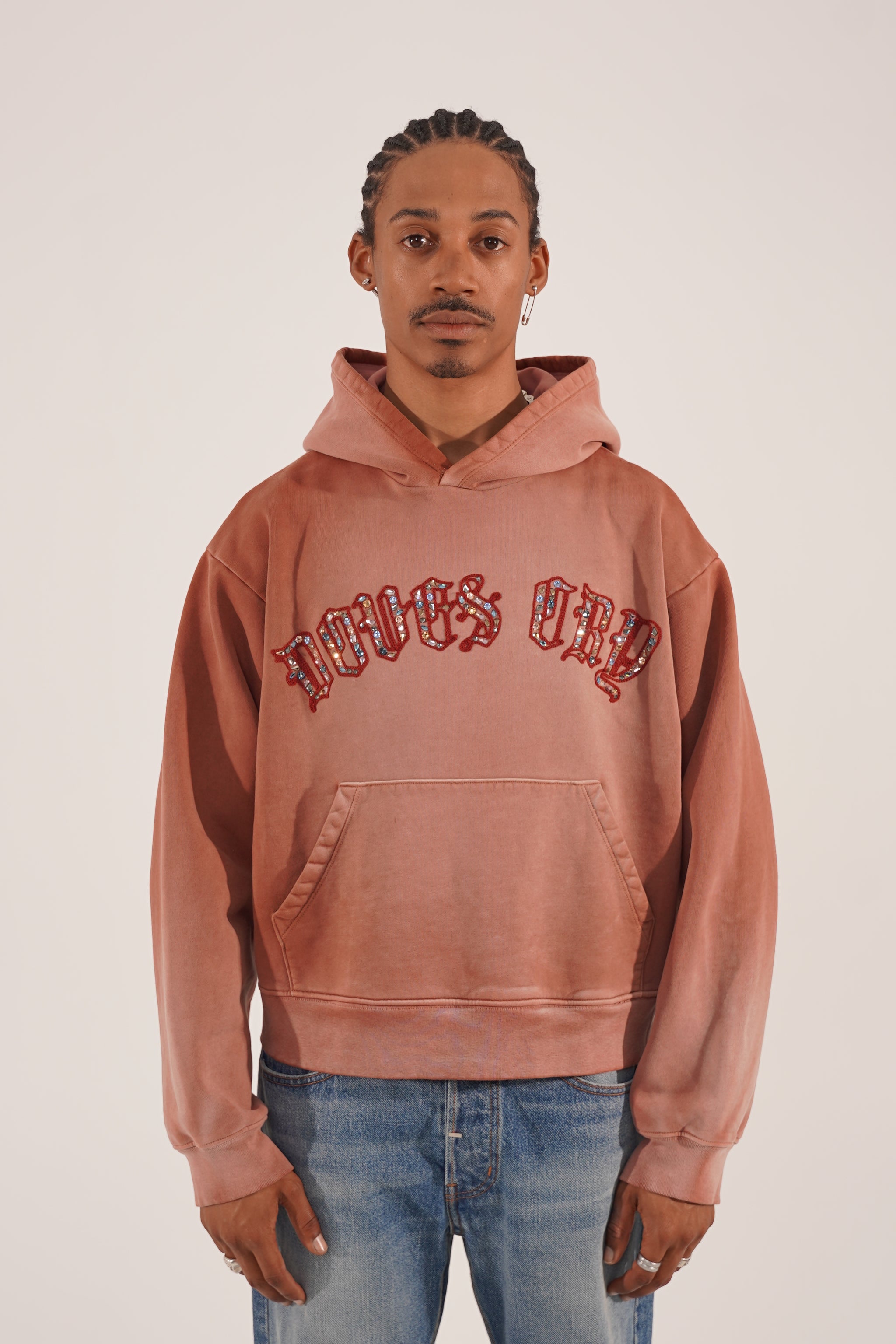 万福玛利亚连帽衫介绍。这款连帽衫采用复杂的链式刺绣,手工镶嵌纯正施华洛世奇水晶,增添了一丝优雅。