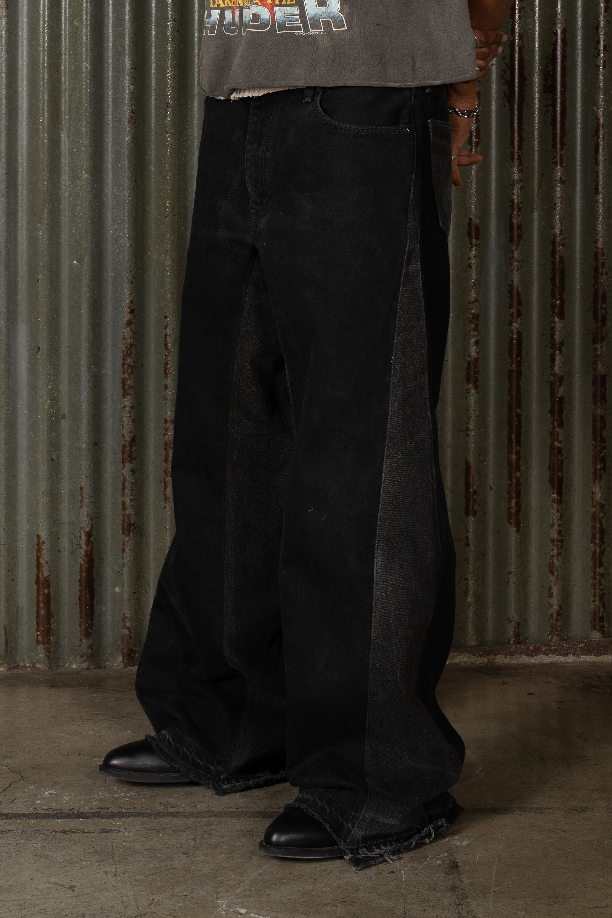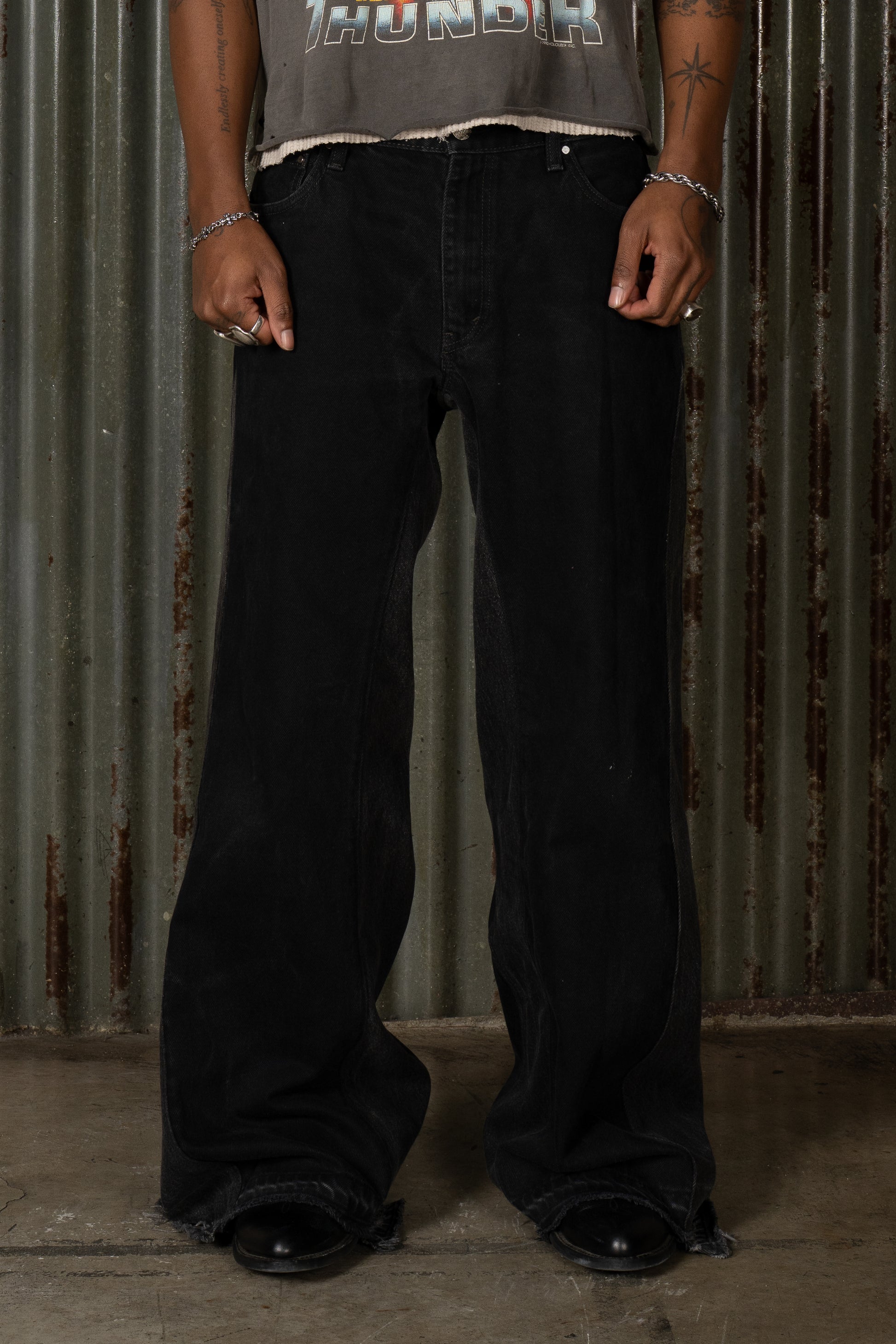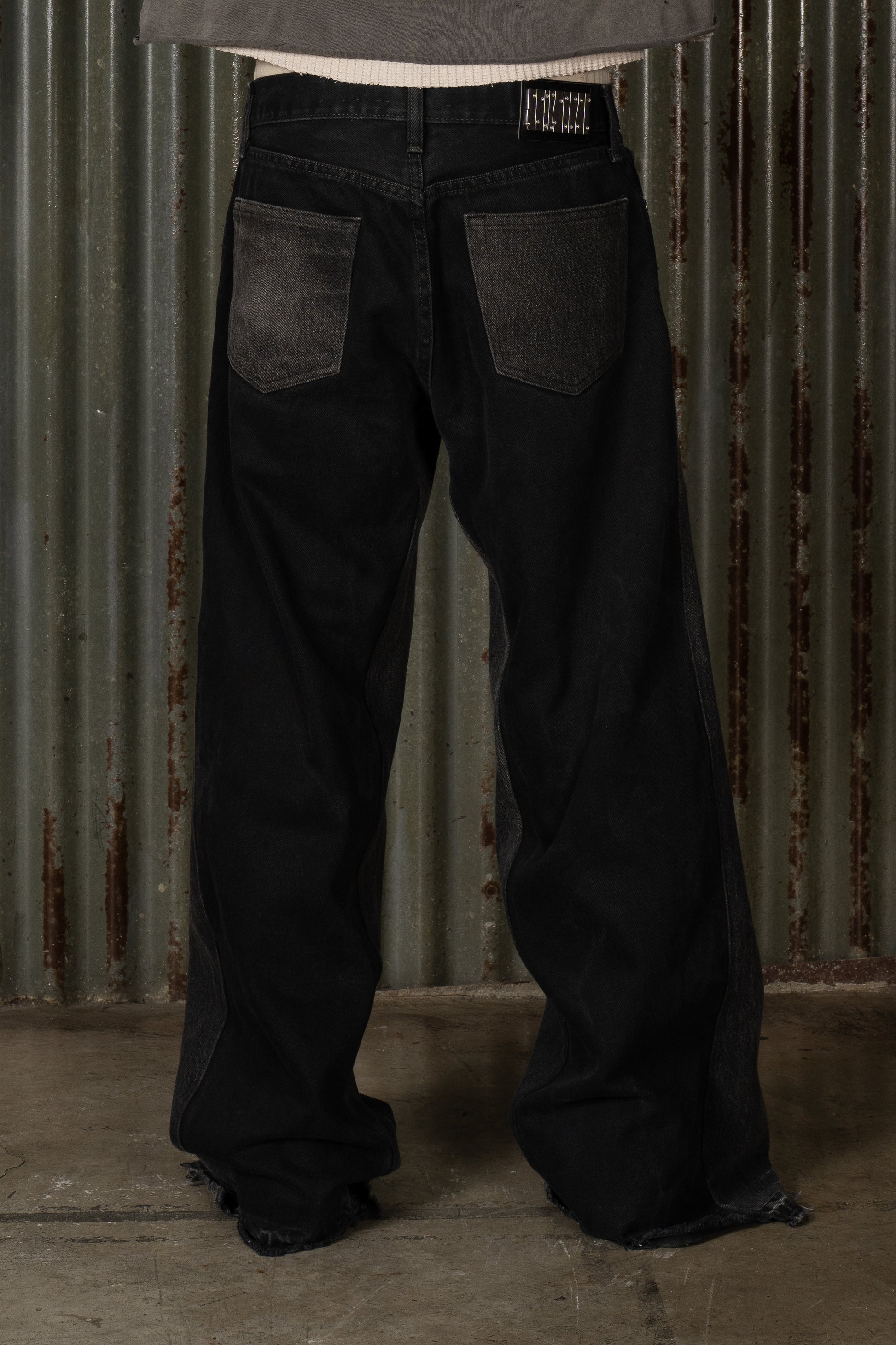 Introducing The Midnight Split Denim. Crafted in black denim, this pant features a clean, deep wash with a split hem detail at the leg opening. The minimal surface and structured construction give it a sharp, controlled finish. Completed as part of the BORN II LIVE Collection.