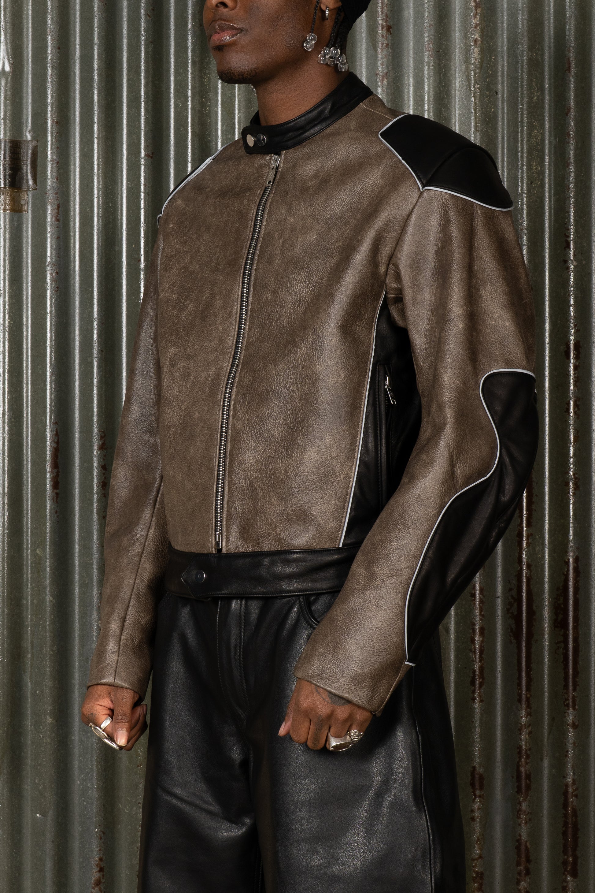 Introducing The Night Rider Leather Jacket. Constructed from cowhide leather, this jacket features a two-tone leather construction with contrasting paneling across the shoulders, sleeves, and body in a yellow and black colorway. Finished with a front zip closure and structured leather collar. This piece is part of the BORN II LIVE Collection.