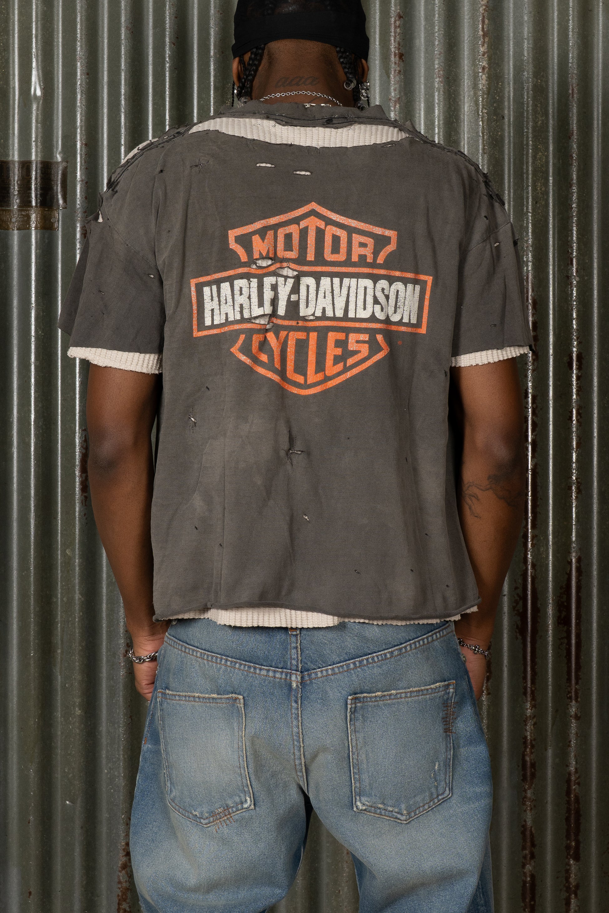 Introducing The Rider Rework Shortsleeve. Crafted from 100% cotton, this piece reworks a classic rider graphic with a layered construction effect, featuring a printed eagle and motorcycle motif across the chest. Distressed detailing is placed throughout the body, adding texture and a worn-in finish. Completed as part of the BORN II LIVE Collection.